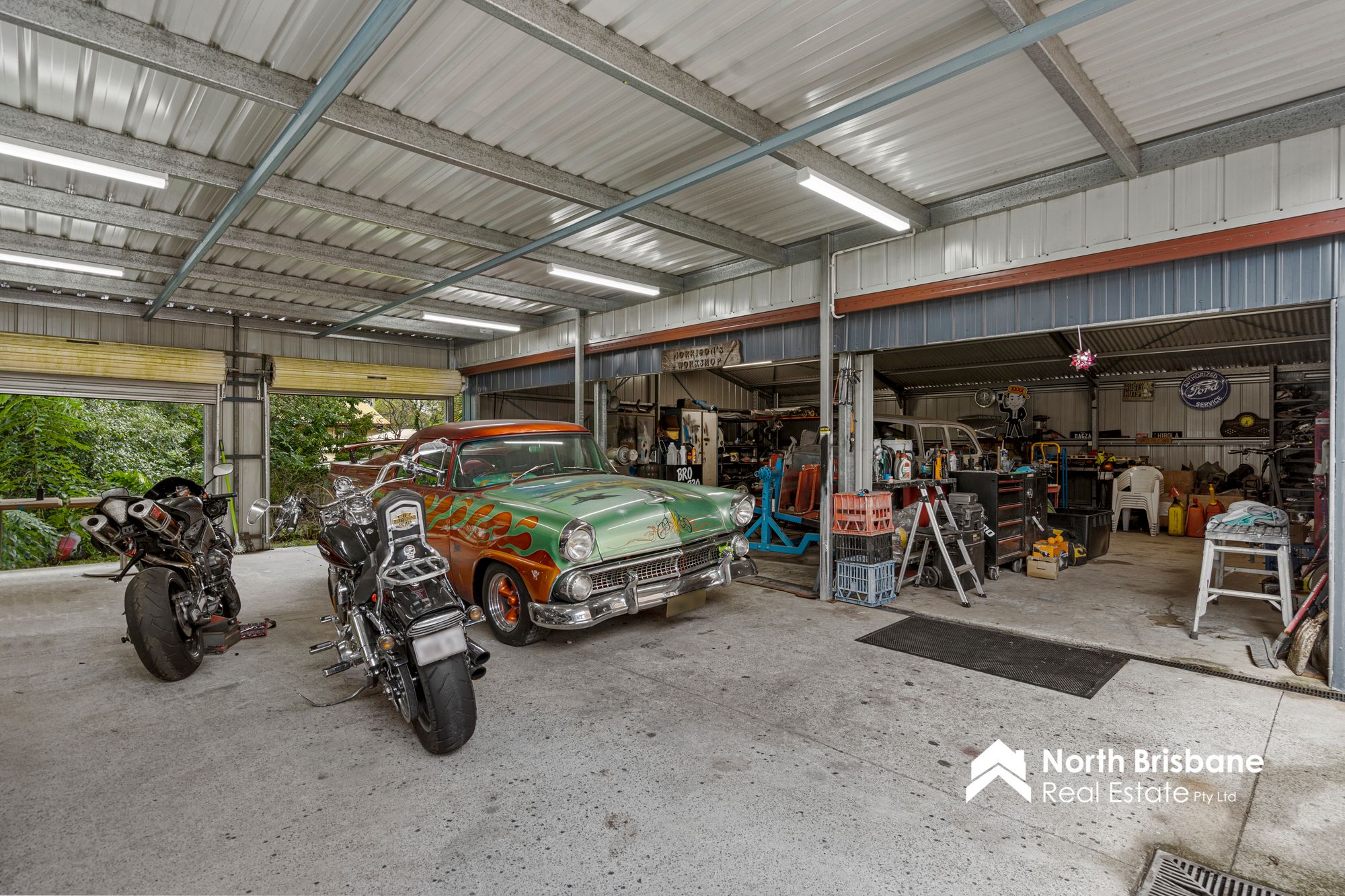 • Ideal setup for a mechanic or car lover with workshop space, sheds & carport all with roller doors