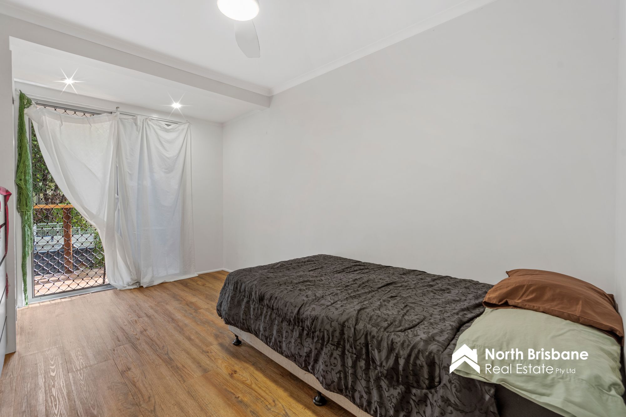 • Second bedroom with ceiling fan and balcony access